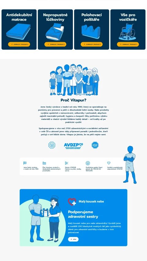 Společnost VITAPUR je rodinná firma založená v roce 1990 Vlastou Veselíkovou. Patří mezi české výrobce zdravotnických prostředků se sídlem a vlastní výrobou v Litomyšli. Více než 30 let se specializuje na vývoj a výrobu pomůcek pro prevenci dekubitů (proleženin). Jejím cílem je zlepšovat kvalitu péče o pacienty, usnadňovat práci zdravotnickému personálu a přinášet řešení, která mají reálný přínos v praxi.